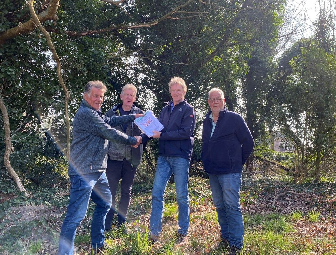 Janus Liebregts voorzitter Adviesgroep BromN ontvangt 800 handtekeningen ‘Behoud het Groene Goud’ van Wijkraden ZW (de Rith) en Steenakker-Noord. (vrnl: Piet Hendrickx (vz ZW-de Rith), Rudi Hafkamp (vz Steenakker-Noord), Tom Jumelet (de Rith), Janus Liebregts
